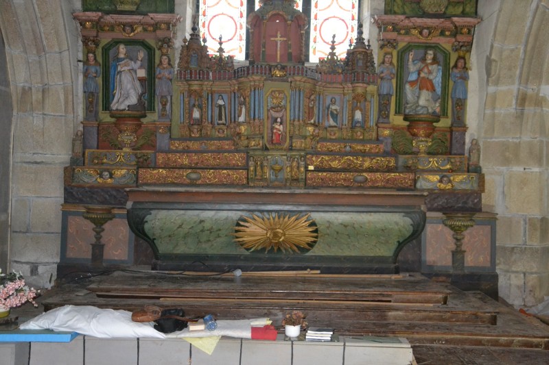 Restauration du retable en bois et consolidation de la structure très endommagée. Reprise de nombreux manques de mouluration et de décor sculpté (feuillage, balustres…), avec restitution des manques par greffes sculptés et moulages. Créations de renforts menuisés pour prévenir la reprise des affaissements constatés.
